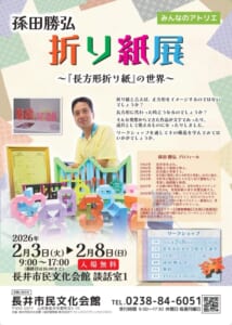 | 時間 | 折り紙展 : 9:00~17:00(最終日は16:00まで) ワークショップ : 2月8日(日)13:00~14:00 定員・対象 / 20名・小学生4年生 ~ 一般 受付 / 1月15日(木)10:00 ~ |